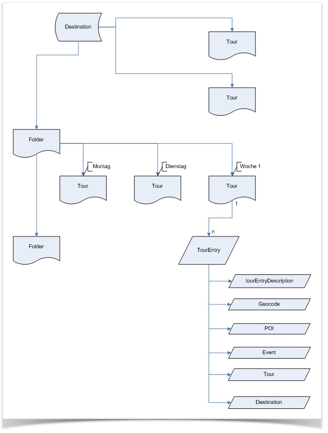 Touren haben einen Orts- bzw. einen Regionenbezug. Sie werden beschrieben durch eine Aneinanderreihung geografischer Punkte, POIs, Events oder Destinationen. Touren können Beschreibungstexte oder Notizen haben und können in Abschnitte geteilt werden. Zusätzlich können Touren in Foldern zusammengefasst werden. Touren und Tourfolder können Destinationen zugeordnet werden.